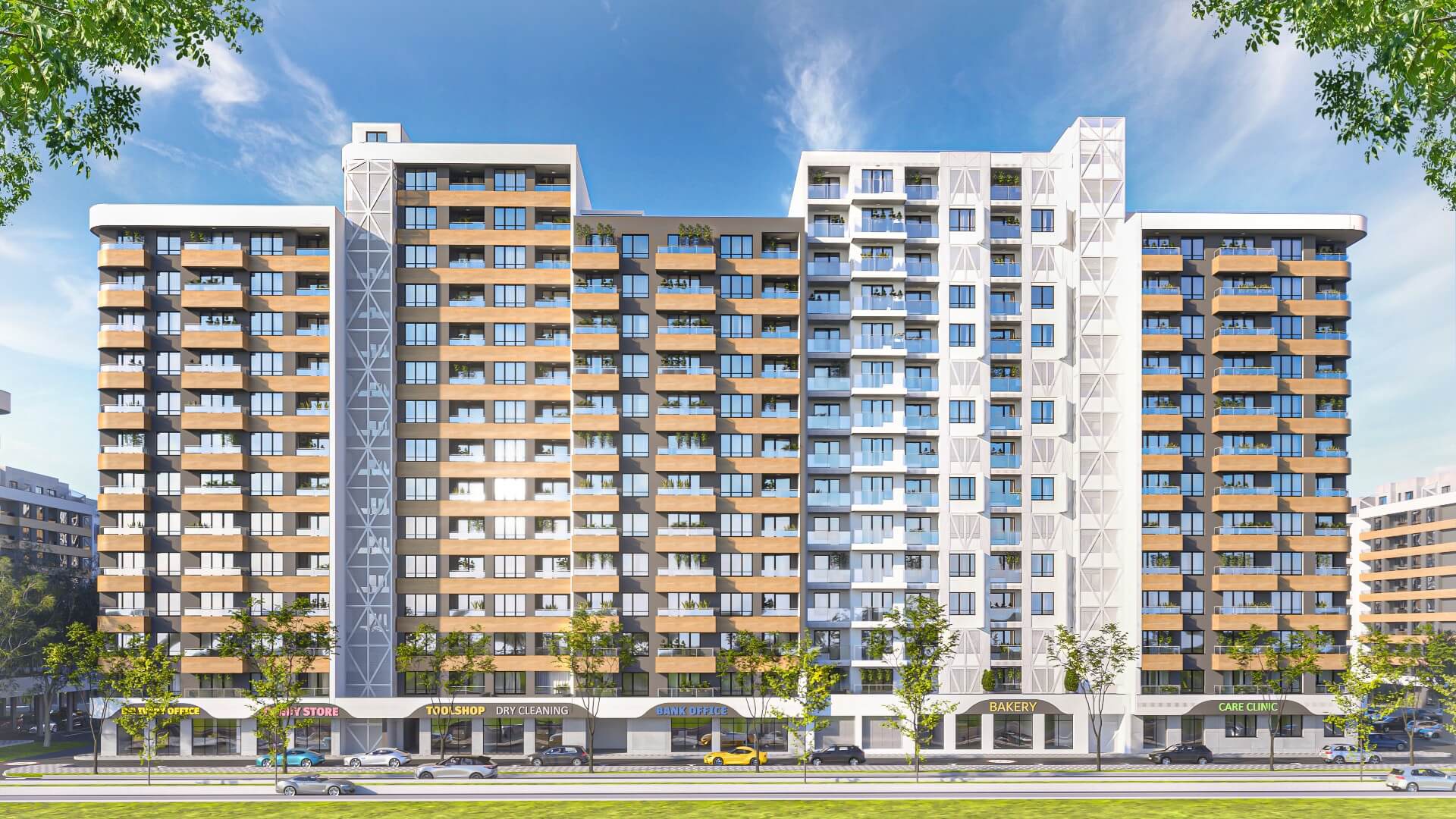 Просторный комплекс состоит из пяти входов, каждый из которых оснащен комфортабельными скоростными лифтами. При строительстве использованы современные технологии и материалы, благодаря которым будут снижены энергетические затраты и обеспечены максимально комфортные условия круглый год. На первом этаже предусмотрены коммерческие помещения – офисы, химчистка, магазин, пиццерия, медицинский кабинет, бистро. Также на партерном уровне расположены апартаменты. К продаже представлены студии, а также квартиры с двумя и тремя комнатами, их площадь – от 41 до 113 квадратных метров. Вся территория комплекса представляет собой зеленую зону, свободную от автомобилей. Подземная стоянка рассчитана на авто разных типов, здесь также есть места для электромобилей и для велосипедов. Обширная собственная инфраструктура включает СПА с внутренним бассейном, медицинский центр, зоны отдыха.